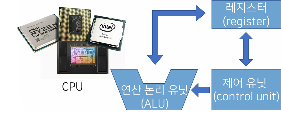 - 명령어와 데이터를 읽고 데이터를 연산 또는 처리하는 장치