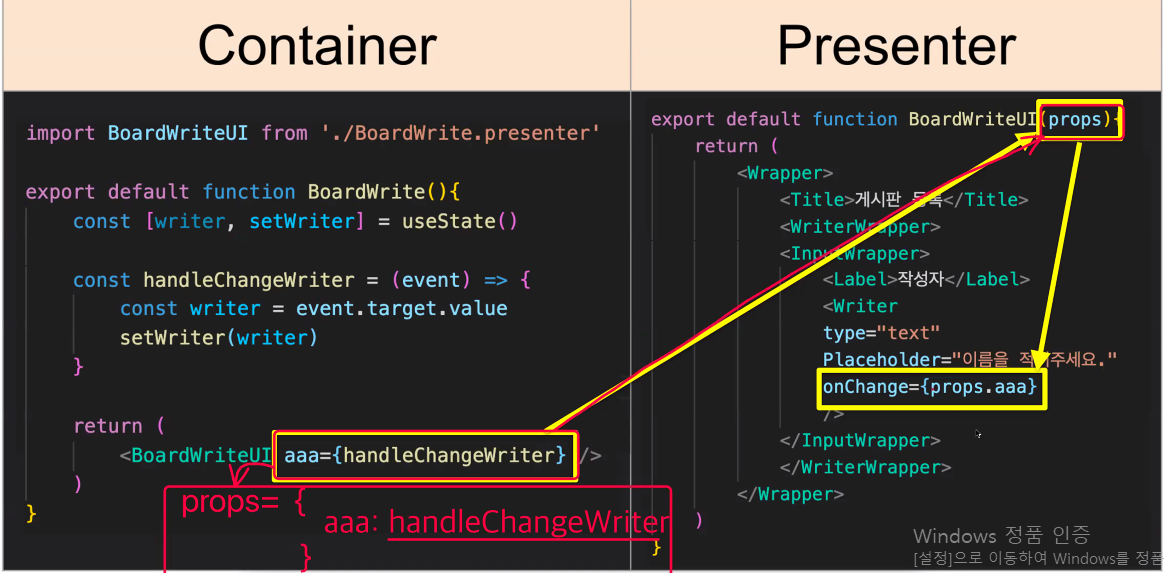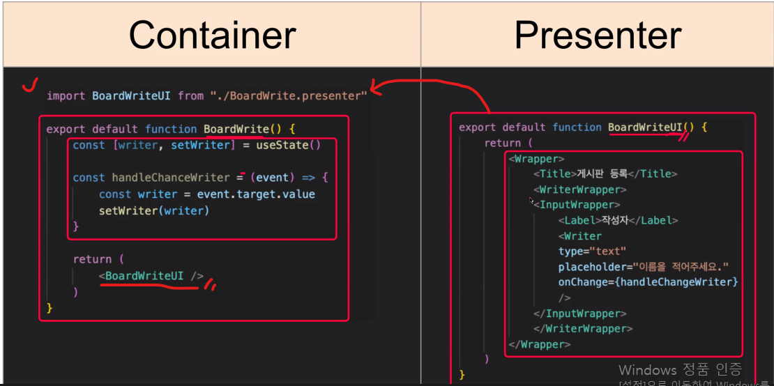 container에 import를 통해 presenter 파일을 불러오고 return() 밑의 JSX part에 present 파일의 컴포넌트 제목을 가져온다.