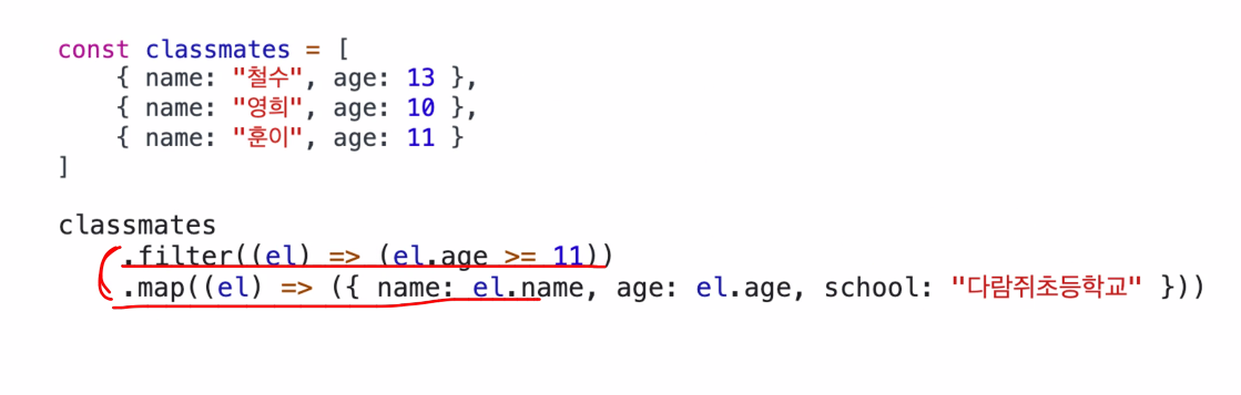 classmates.map( () => () ) 에서 classmates.map( (el) => el+' ' ) 등으로 소괄호를 생략할 수도 있다. 이는 화살표함수이기 때문에 가능한 로직이다.