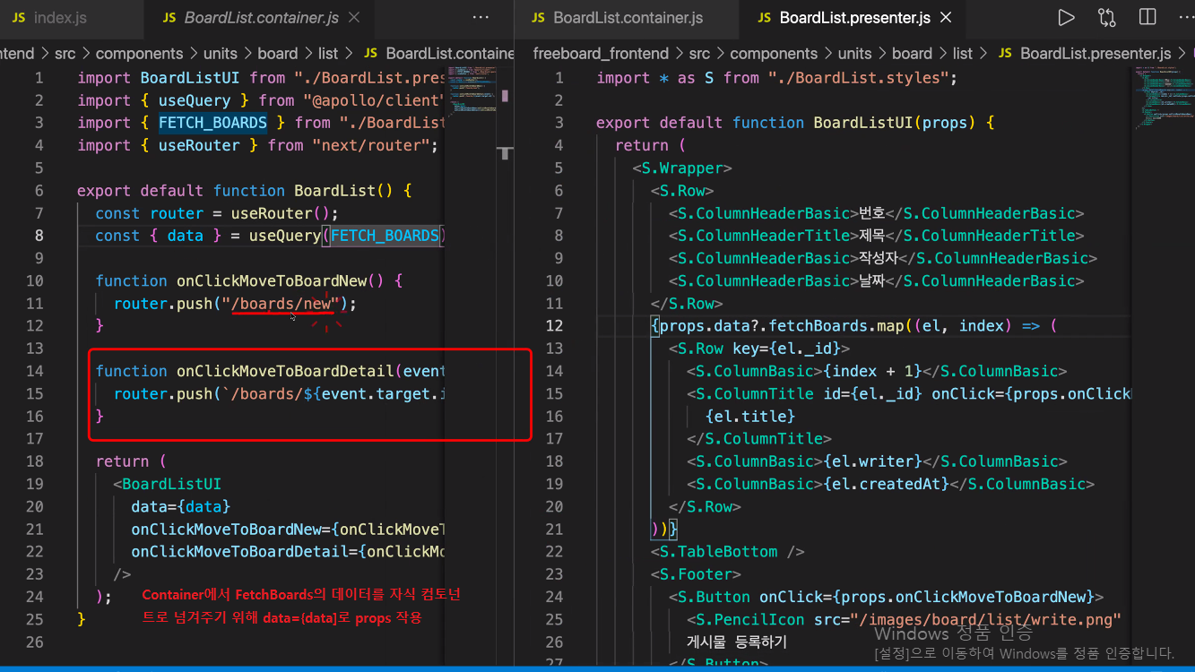 컴포넌트를 사용해 임포트 해주는 경우 부모 컴포넌트의 기능(함수)은 꼭 props를 통해 자식 컴포넌트에 전달하여 사용해줄것.