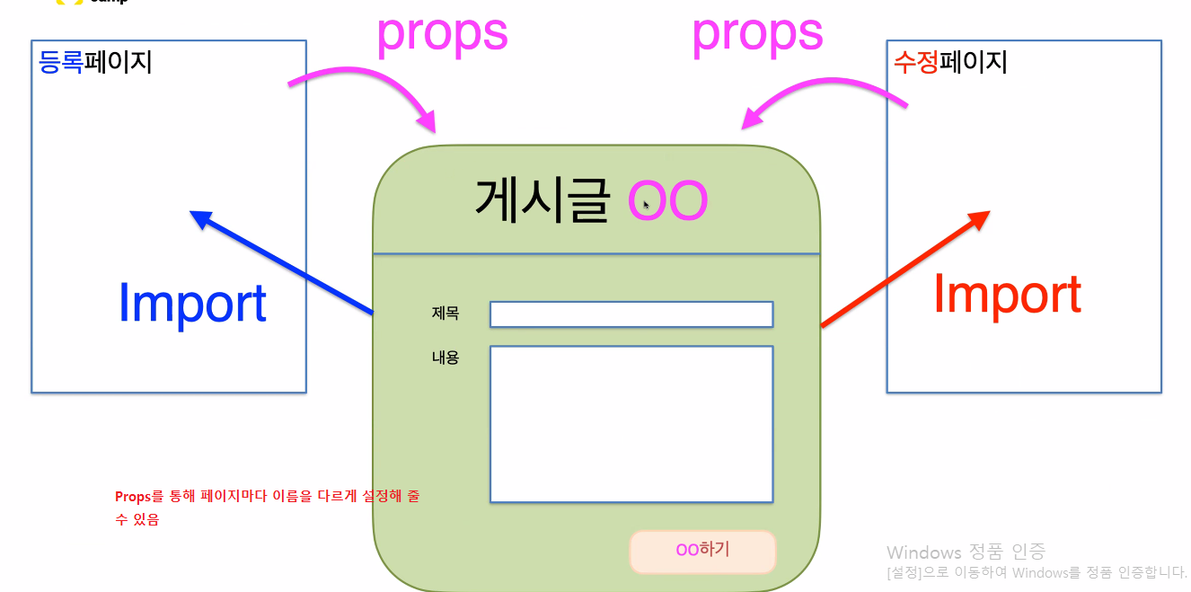 상황2) 게시글 컴포넌트를 만들고 수정, 등록 페이지에서 임포트해서 사용하는 경우.