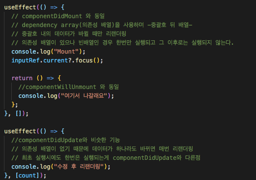 위 네 종류의 명령어를 통해 처음 랜더시, 그리고 난 뒤, 그린 뒤 변경됐을 때, 그리고 난 뒤 사라질 때 등 랜더링 단계에서 실행될 것들을 지정할 수 있다.