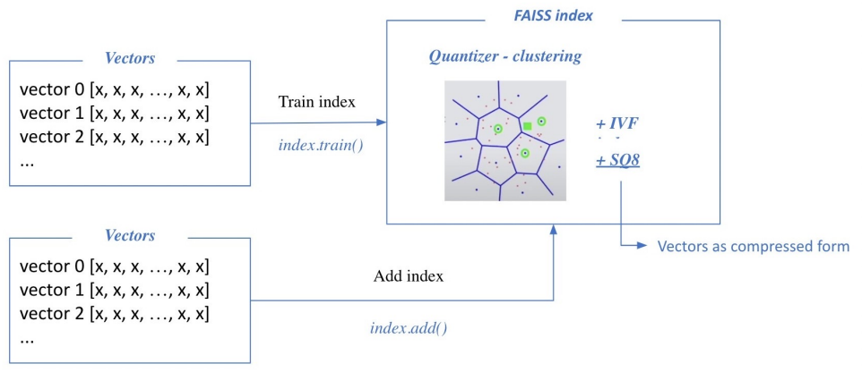 IndexIVFPQ를 이용하면 전체 벡터를 저장하지 않고 압축된 벡터만을 저장하며, 메모리 사용량을 줄일 수 있음