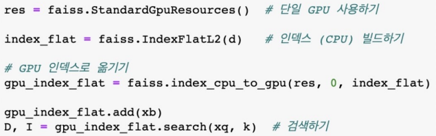 D, I = index.search(xq, k) # D: 쿼리와의 거리, I: 검색된 vector index