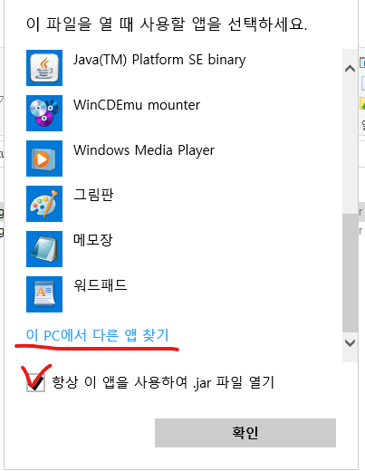 항상 이 앱을 사용하여 파일 열기 체크! - 이 pc에서 다른 앱 찾기