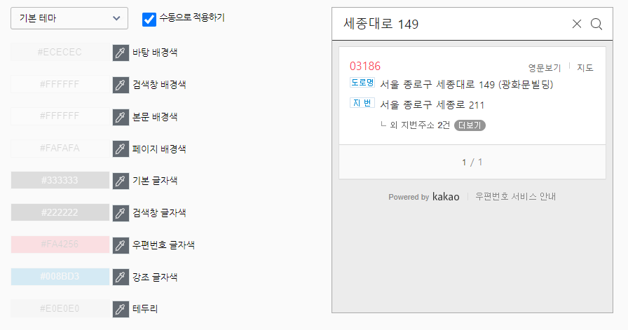 우편번호 서비스 화면의 색상 테마를 변경하는 props 입니다.
