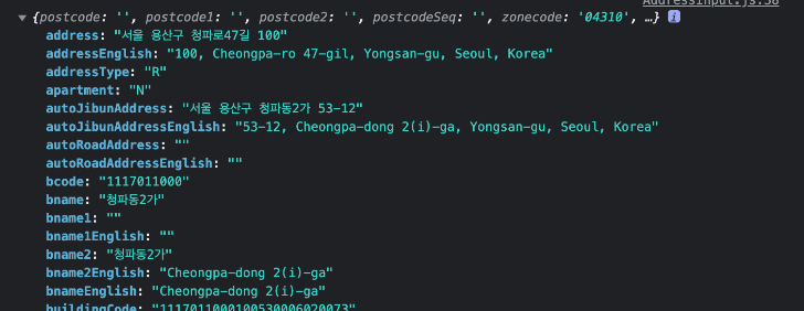 참고로 리액트에서 쓸 수 있는 react-daum-postcode 패키지가 있어서 이 패키지를 사용했습니다.