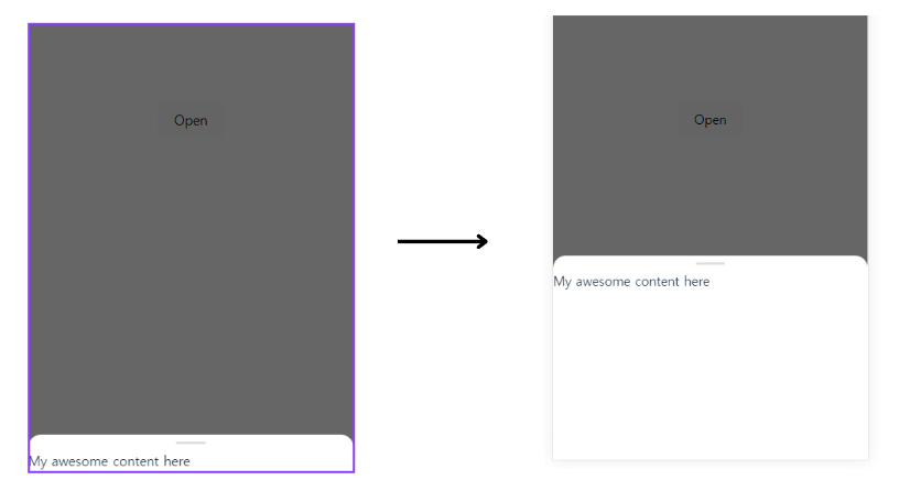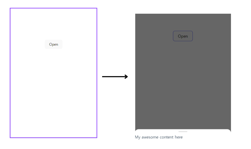 이렇게 open 버튼을 클릭하면 true 로 활성화 하면서 밑에서 BottomSheet 가 올라옵니다.
