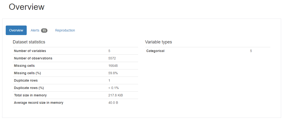 하나의 행, 열을 cell로 봤을 때 5 * 5572개의 셀이 존재하고, 그 중 16,648(59.8%)가 결측값으로 확인됨