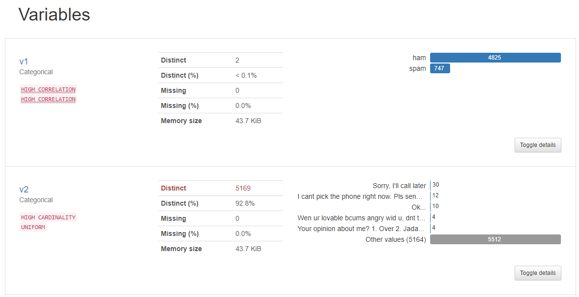 - text가 들어있는 v2를 보면 5169개의 unique한 관측치가 있음 -> 총 rows는 5572이므로 5572 - 5169 = 403개의 메일의 중복이 있다는 것을 알 수 있음