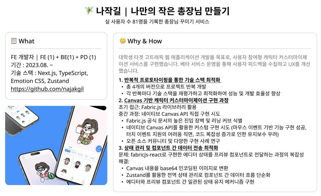 그 피드백을 듣고 저는, 단순히 ‘기술적으로 내가 힘들었던 경험’보다 ‘사용자의 문제를 정의하고 해결까지 주도했던 경험’을 보여주는 프로젝트가 앞에 와야 한다는 걸 알게 됐습니다.