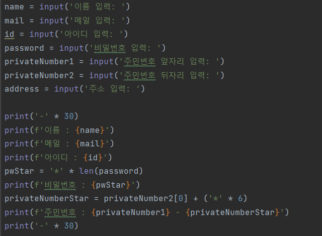 : 입력할 뒷자리 첫 번째 수인 2를 추출한 후 나머지 개수만큼 **를 곱해준다.😮str[0] : str에 저장된 문자열에서 첫 번째 문자를 반환함