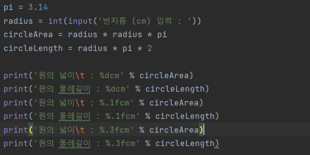 원의 반지름을 입력하면 원의 넓이와 둘레 길이를 출력하되, 아래와 같은 형식으로 출력해보자. (정수, 소수점 한자리, 소수점 셋째자리)