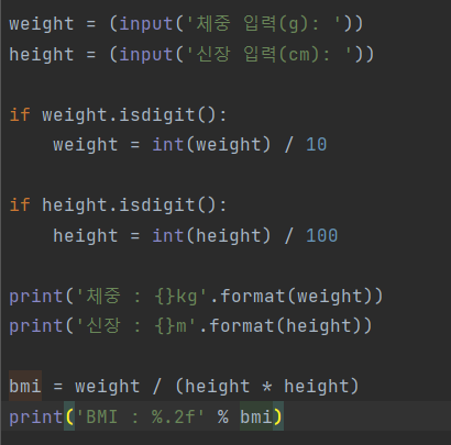 체중(g)과 신장(cm)을 입력하면 BMI지수가 출력되는 프로그램을 만들어 보자.