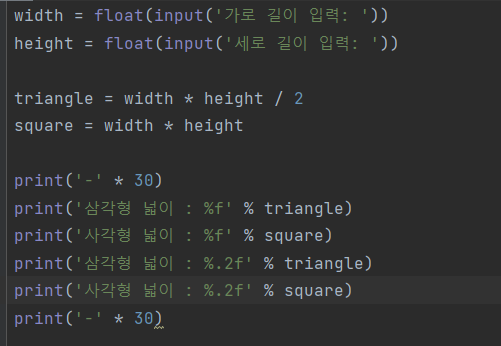 아래의 출력 결과와 같이 사용자가 입력한 데이터를 모두 실수로 변경한 후 사각형, 삼각형의 넓이를 출력해보자.