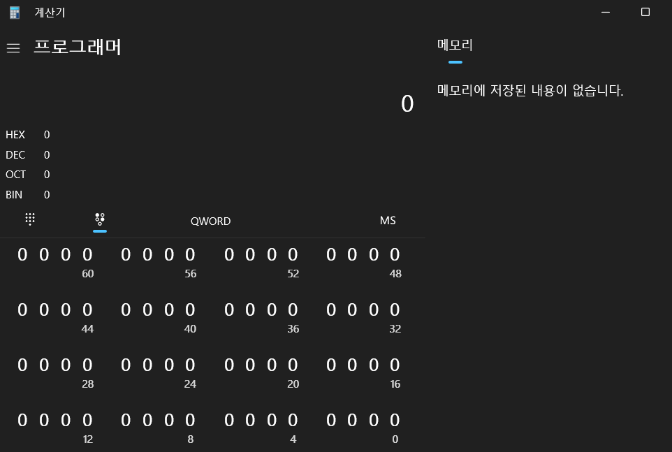 20은 2진수로 00010100입니다./// 윈도우 계산기 - 프로그래머로 가면 이렇게 비트 계산기를 쓸 수 있음