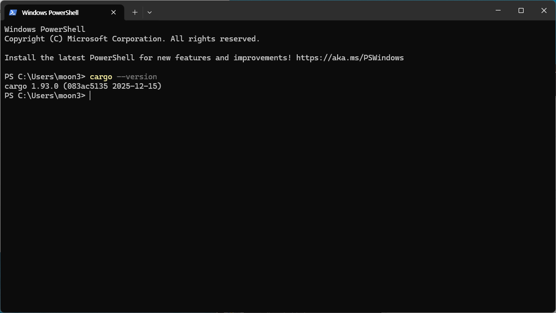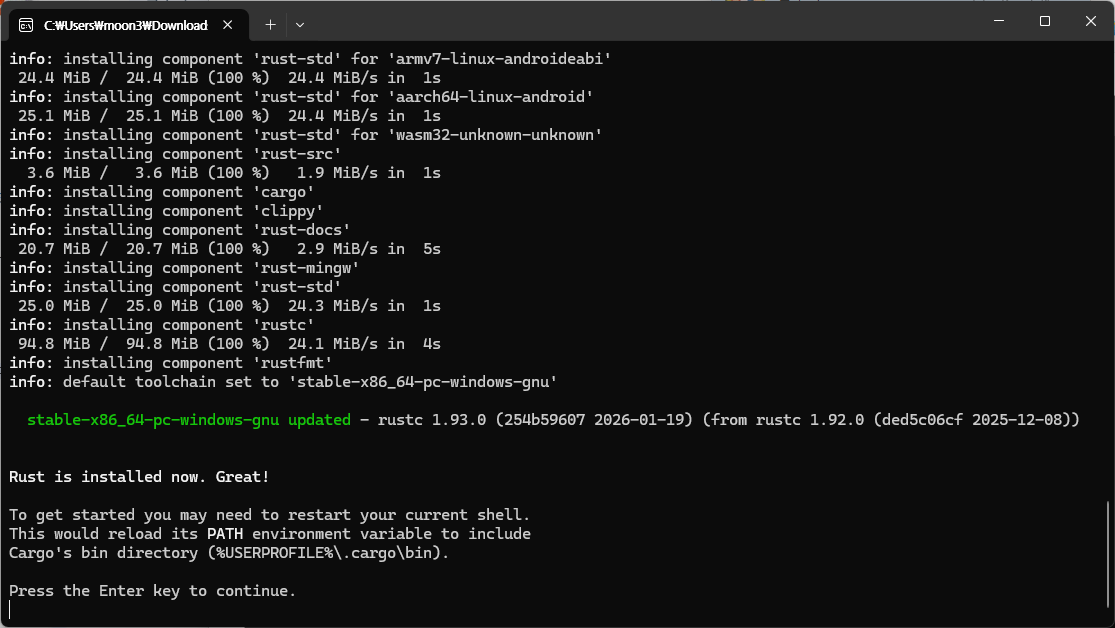 터미널 켜서 cargo --version 입력하여 버전이 출력된다면 설치가 완료 된것이다.