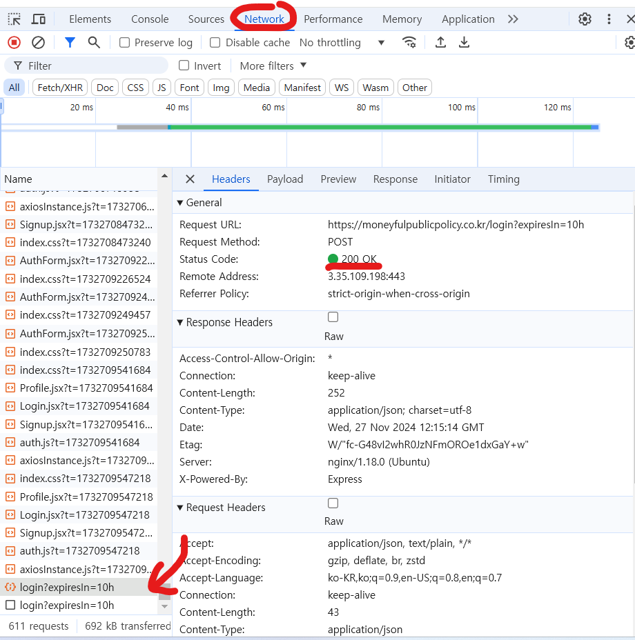 개발자 도구 Network tab을 활용하여 서버 요청이 어떻게 되어가고 있는지 파악이 가능했다.