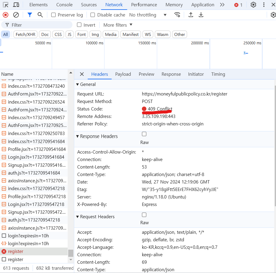 ^ 이미 등록된 유저로 다시 회원가입을 해보려고 하면 409 에러가 뜬다