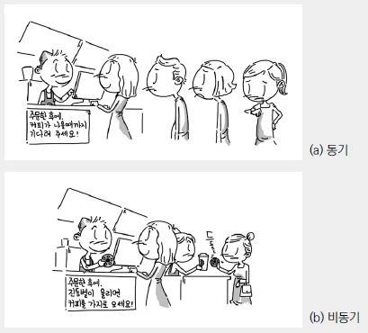 일을 처리하는 순서에 있어 이전 순서의 응답을 받고 가는것과 우선 요청부터 보내고 응답을 보내느 것의 차이