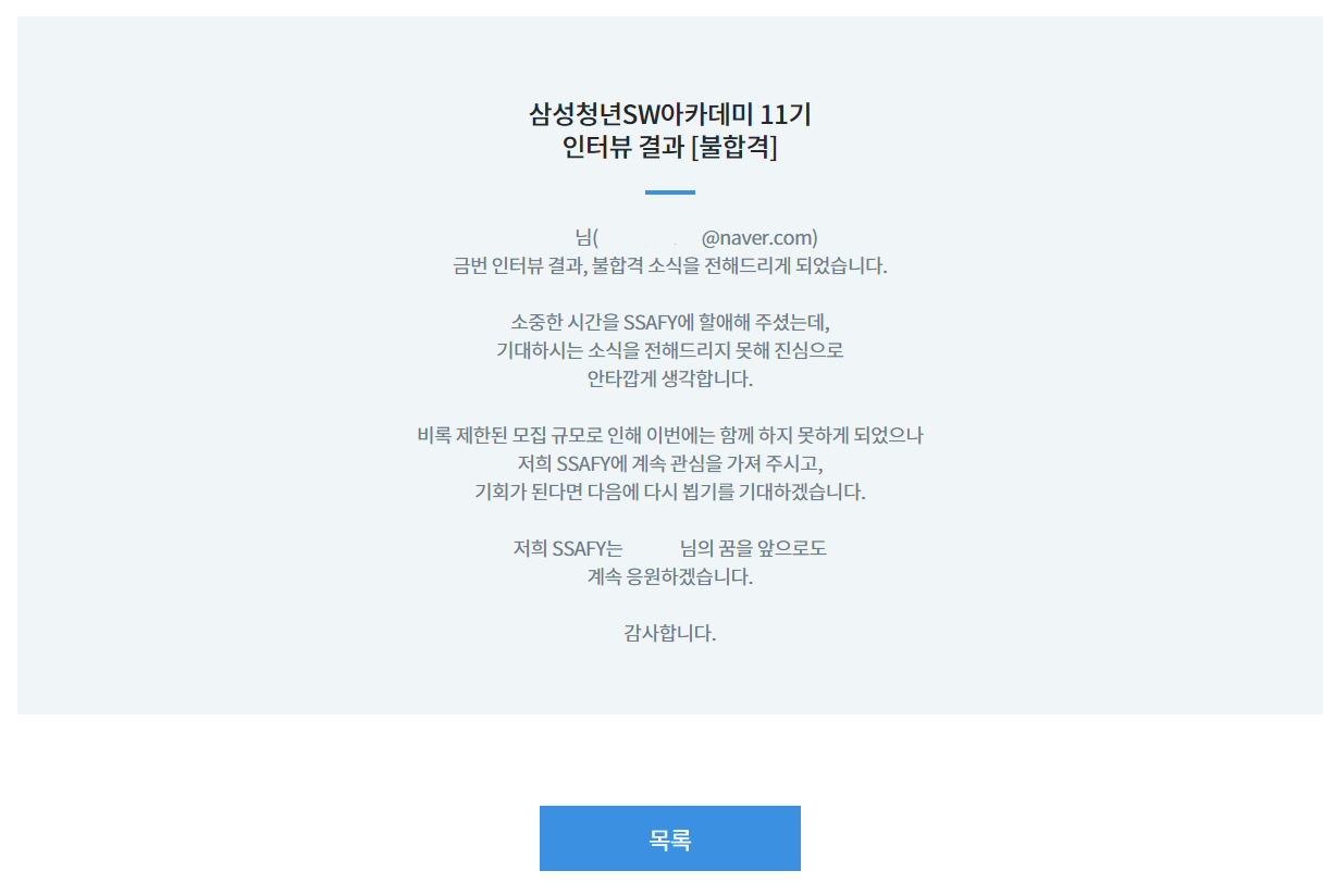 비록 입과는 하지 않았지만 추가합격 라인 까지 오르게 해준 싸피 운영진 분들과 면접 스터디를 같이 했던 분들께 정말 감사 인사를 드리며 싸피를 도전하며 면접 준비에서 굉장히 많이 배울 수 있었습니다.