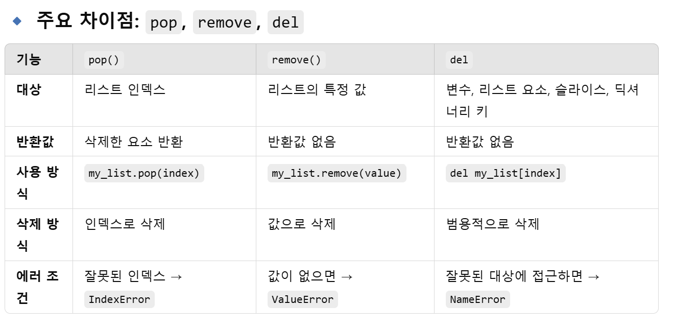이 코드를 보고 pop, remove,del의 차이가 궁금해져서 찾아봄