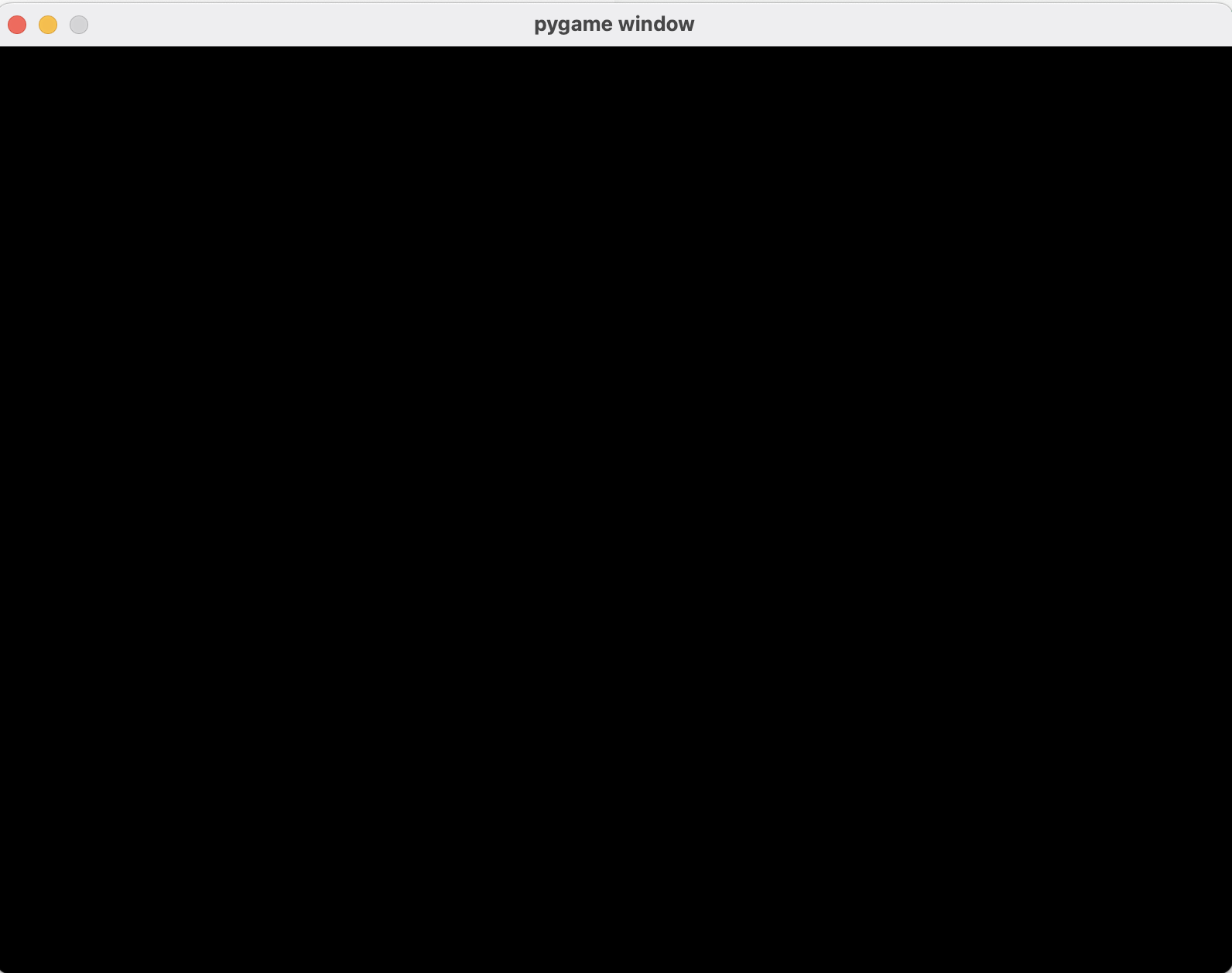 이렇게 검은색의 800X600 크기의 창이 생성되었다. 띄운 창은 while문 무한 루프로 작동되고 for문에서 pygame.event.get()에 있는 event의 type이 pygame.QUIT일때 pygame.quit()라는 함수가 실행되어 pygame 라이브러리를 꺼지게 한다.