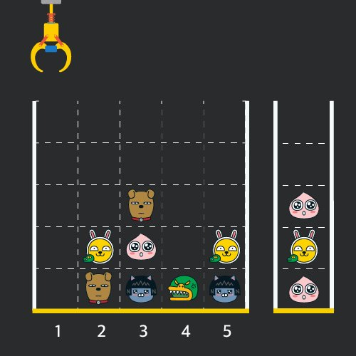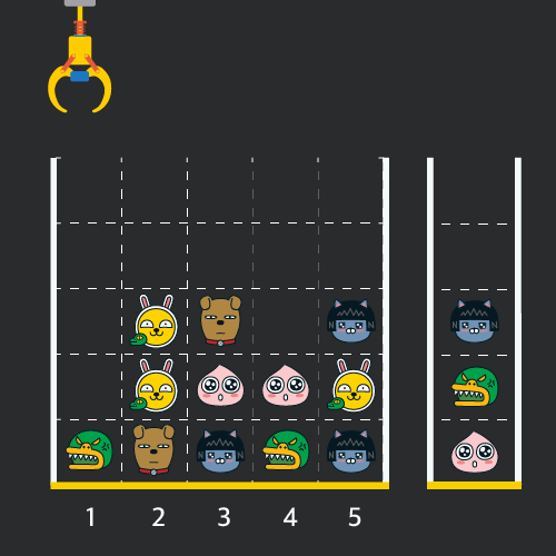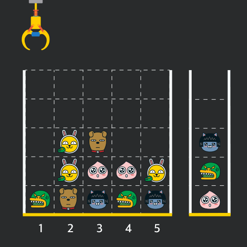 게임 화면은 "1 x 1" 크기의 칸들로 이루어진 "N x N" 크기의 정사각 격자이며 위쪽에는 크레인이 있고 오른쪽에는 바구니가 있습니다. (위 그림은 "5 x 5" 크기의 예시입니다). 각 격자 칸에는 다양한 인형이 들어 있으며 인형이 없는 칸은 빈칸입니다.