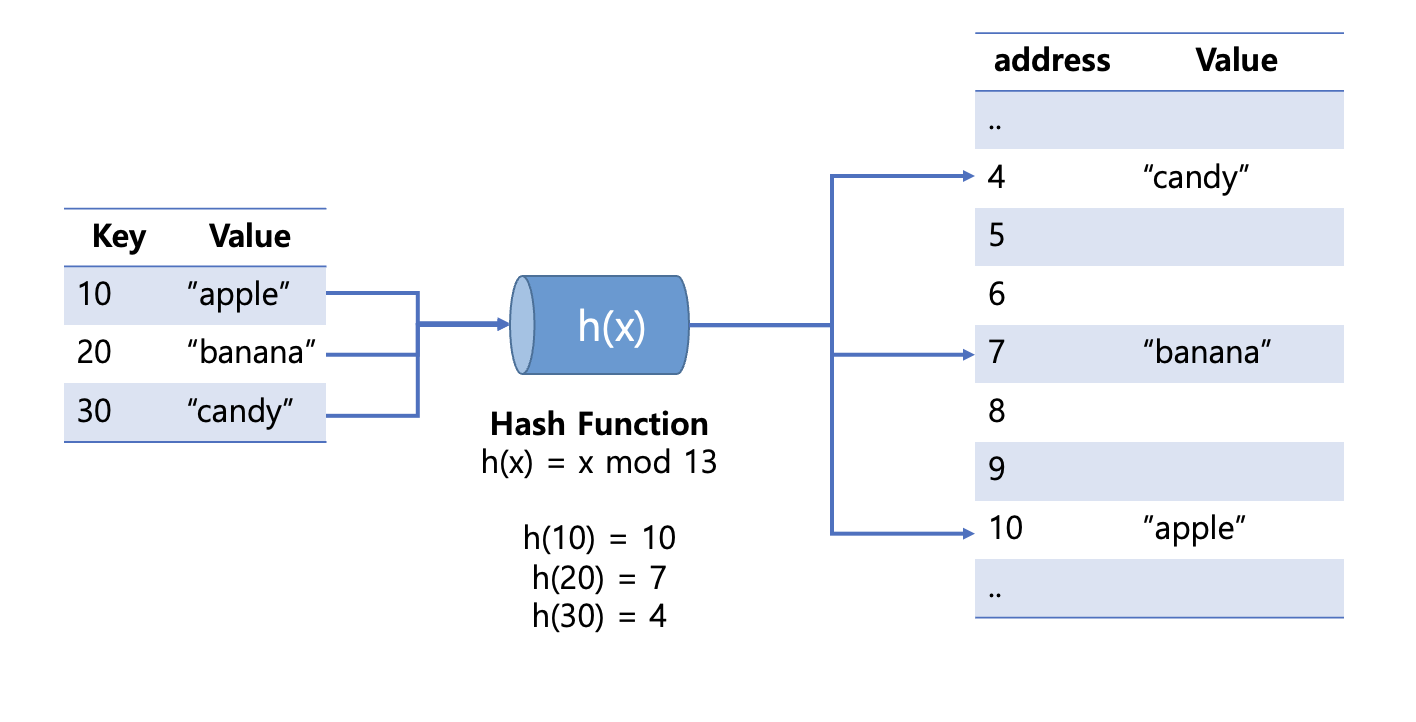 ex) 해시 함수가 h(x) = x mod 13 (x를 13으로 나눈 나머지) 일 때,