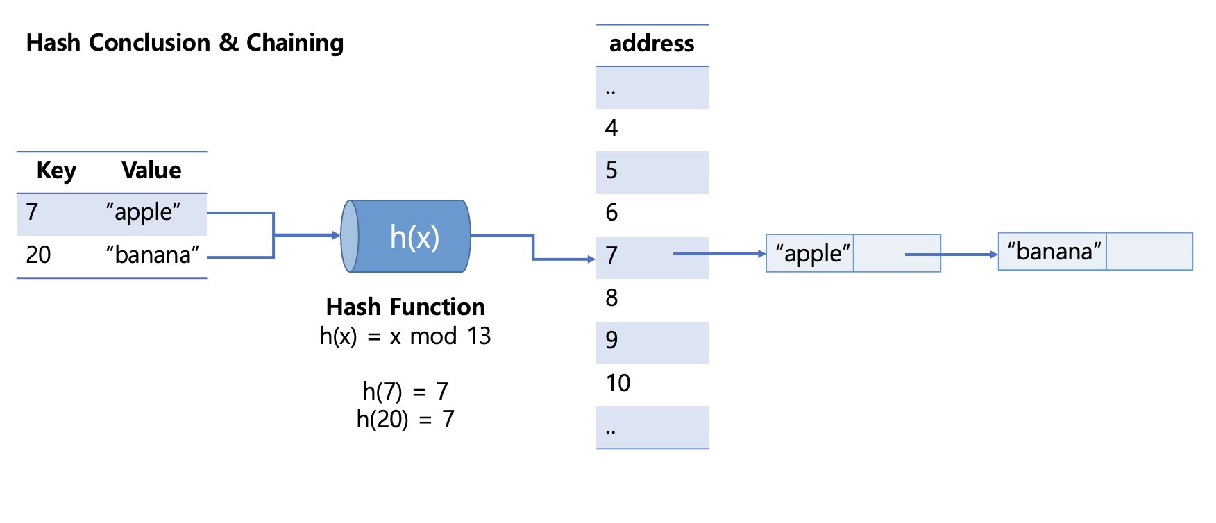 - 해시테이블의 값에 해당하는 부분에 연결리스트의 주소값을 넣어 모든 값을 관리한다.