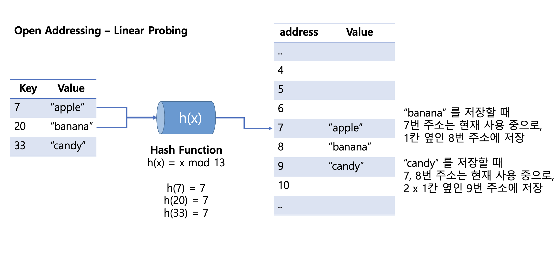 - 해시 충돌이 발생하면 테이블 중 비어있는 새로운 주소를 탐사한 후, 탐사한 주소에 충돌된 데이터를 입력함