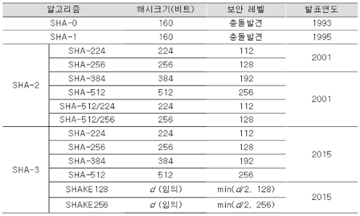- NSA(미국 국가안보국)에 의해 1993년 처음 개발된 해시 알고리즘
