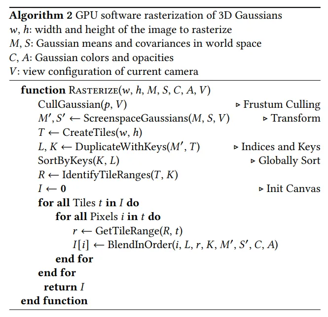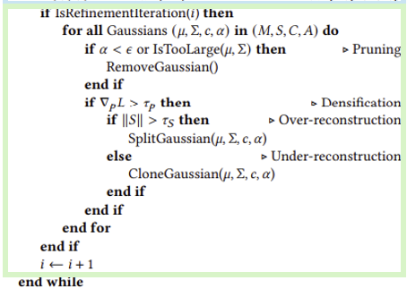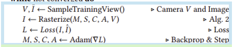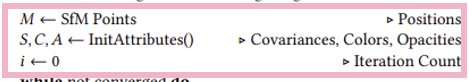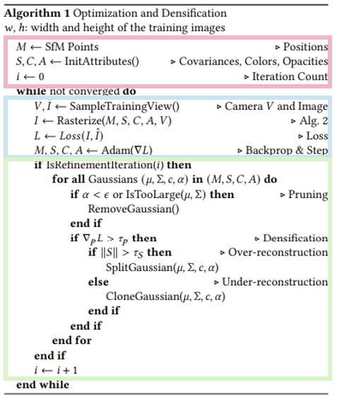 Psuedo code를 보면 크게 Initialization, Rasterization, Optimization, Densification 과정으로 나뉜다.