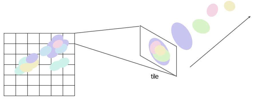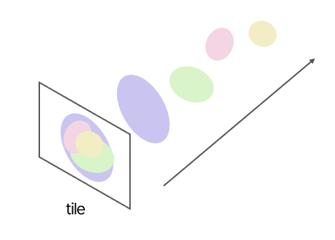 각 Tile이 병렬적으로 가우시안들을 처리하고, 픽셀 단위에서 depth 순서대로 blending이 이루어진당