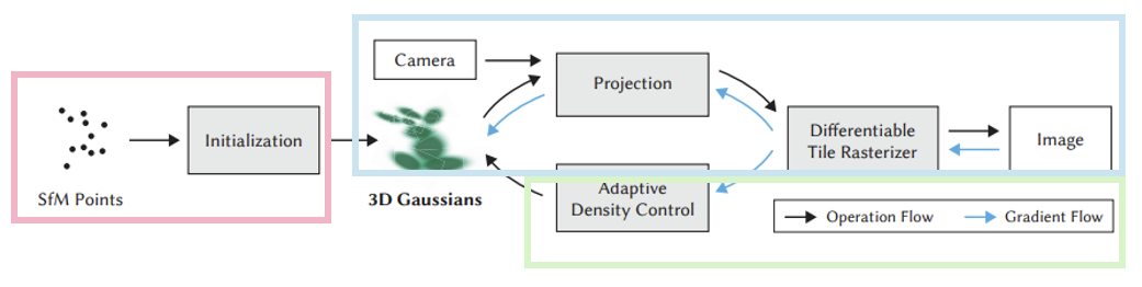 Initialization: COLMAP과 같은 SfM 알고리즘으로 camera pose와 point cloud 정보를 얻는다. 이때 얻은 point cloud가 3D Gaussian의 초기값으로 사용된다.