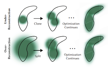 특정 scale threshold보다 크면 split하고, 작으면 clone한다. 너무 크게 확장된 경우, 하나의 가우시안을 2개로 나누고 크기를 1.6배 감소시킨다.