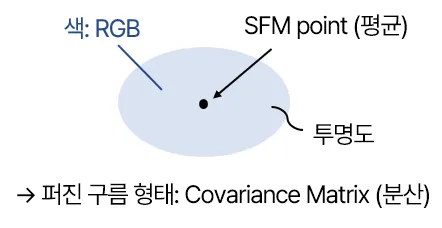 3D Gaussian은 타원체의 형태로, 평균과 공분산(3x3행렬) 값을 갖고 있다. 색상, 투명도 값까지 정의하면 3D Gaussian Splatting이 가능하다. 투명도(opacity)는 해당 가우시안이 scene에 얼마나 기여하는지 나타낸다.