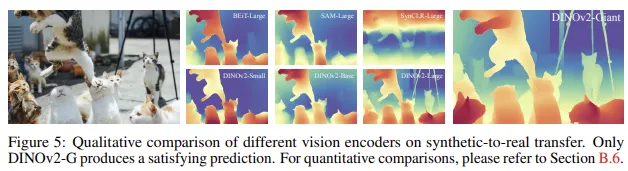 Pre-trained image encoder를 synthetic만 사용해서 MDE로 학습하면 어떻게 되는지 실험을 했는데, 그 결과 DINOv2-G만 만족스러운 결과를 냈다.