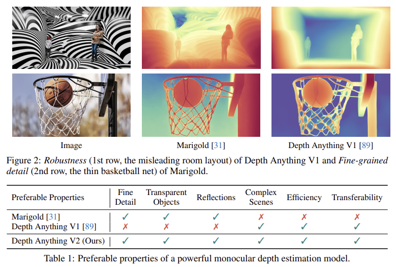 Depth Anything V2는 위 표처럼 기존 MDE 모델들의 단점을 극복하고자 한다.