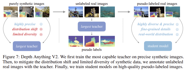 Depth Anything V2는 단순히 synthetic만 사용하지 않고, Unlabeled real image도 활용하여 성능을 높였다.