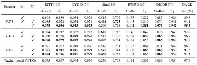 작은 모델(ViT-S, ViT-B)도 합성 데이터 없이, pseudo labeled 데이터만 사용했을 때 더 나은 성능을 보였고, DA-2K 기준으로도 가장 높은 정확도를 기록했다.