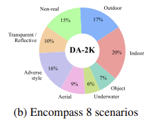 DA-2K는 8가지 다양한 시나리오(Indoor, Transparent...)를 포함하고, GPT-4로 생성한 키워드를 기반으로 Flickr에서 이미지를 수집해 구성되었다.
