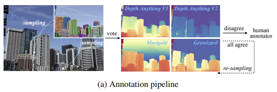 먼저 SAM 모델로 객체 마스크를 예측하고, 그 마스크의 중요한 픽셀을 샘플링한다. 그 다음 깊이 추정 모델 4개(Depth Anything V1, Marigold, GeoWizard, Depth Anything V2)가 두 픽셀 중 어떤 점이 더 가까운지 예측하고 투표한다. 모든 모델의 예측이 일치하면 그대로 사용하고, 예측이 엇갈리면 수동으로 라벨링하거나 re-sampling한다.