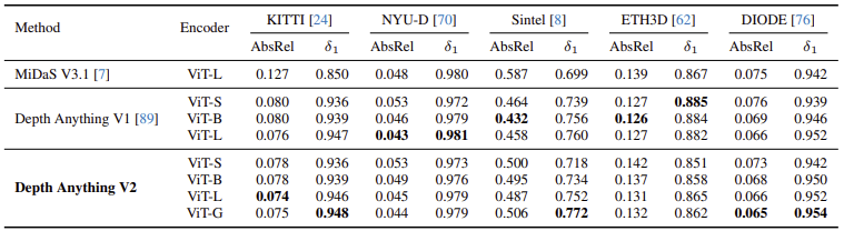 기존 test set(NYU-D, KITTI 등 5개)을 기준으로 MiDaS와 V1을 비교했을 때, V2는 MiDaS보다 우수하고, 대부분 V1과 비슷하거나 살짝 뒤처지는 성능을 보였다.