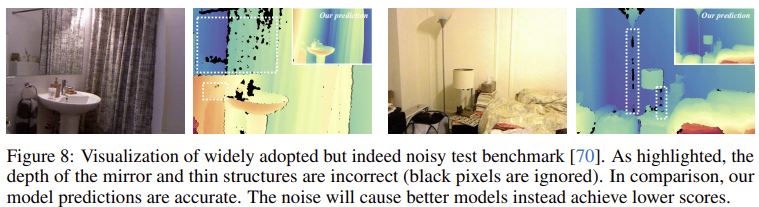 하지만 real labeled depth map는 깊이 센서의 한계 때문에 깊이 정보가 부정확하고, 디테일이 무시되는 문제가 있다. 이런 데이터를 학습하면 경계선을 정확하게 구별하지 못해서 세밀한 깊이 정보를 예측하는 능력이 저하된다.