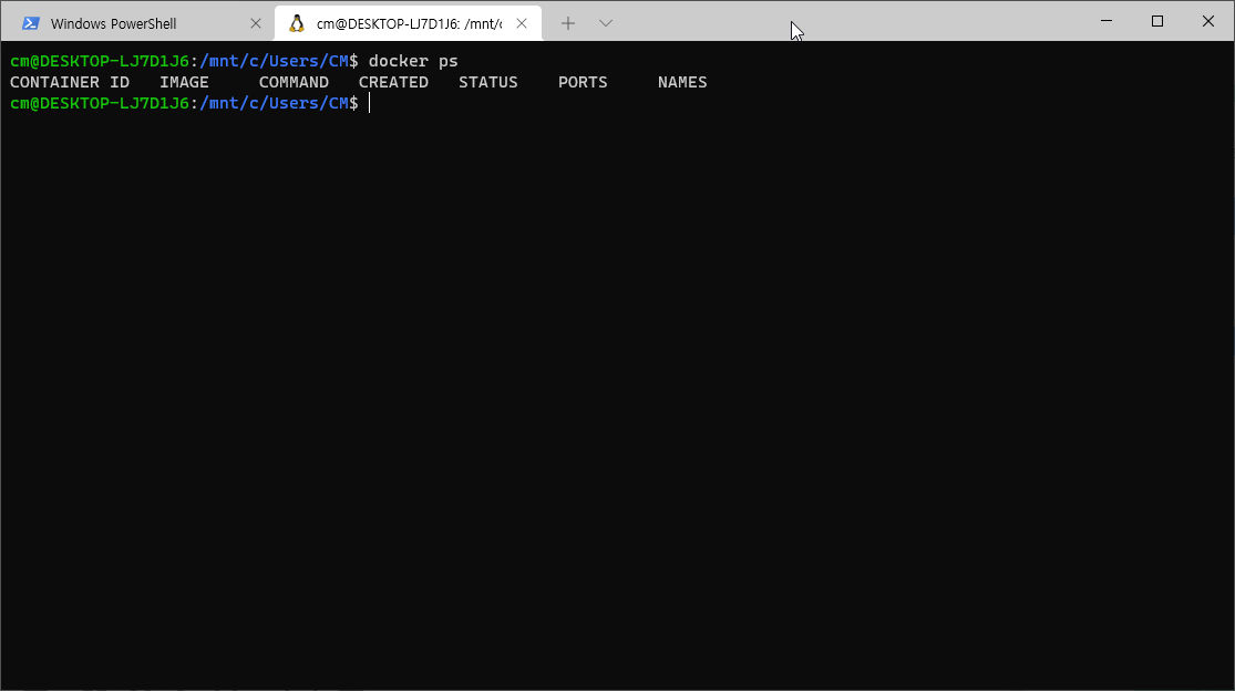 docker ps 명령을 통해 docker가 WSL2에서 정상적으로 작동하는지 확인한다.