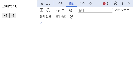 콘솔창에서는 count 값이 변화하고 있지만, 화면에서는 값의 변화가 일어나지 않고 있습니다.