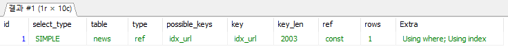 Extra에 Using Index로 인덱스를 사용한 것을 알 수 있다.