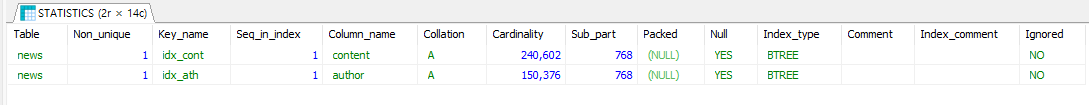 인덱스를 재생성 하고 인덱스를 다시 조회해보면 Cardinality가 재계산되어 늘어난 것을 볼 수 있다.