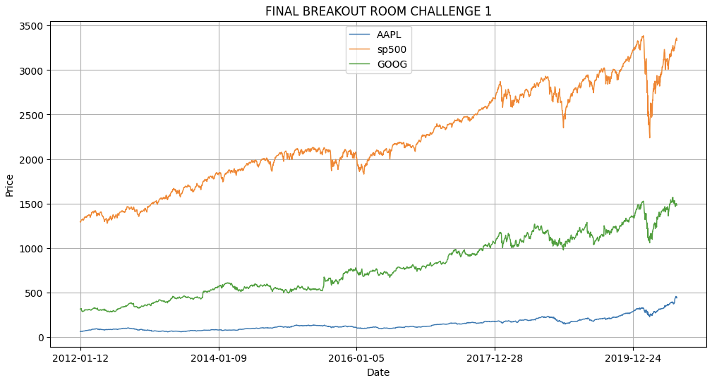 stock_df.plot(x='Date', y=['AAPL', 'sp500', 'GOOG'], title='FINAL BREAKOUT ROOM CHALLENGE 2',